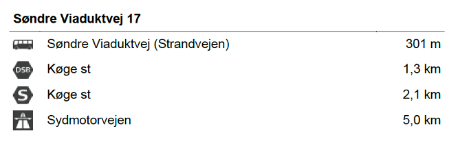 Der er gode tilkørselsforhold, da man kan komme til ejendommen direkte via Søndre Viaduktvej, en større og trafikeret vej i Køge. Der er gode parkeringsforhold og fællesarealer.